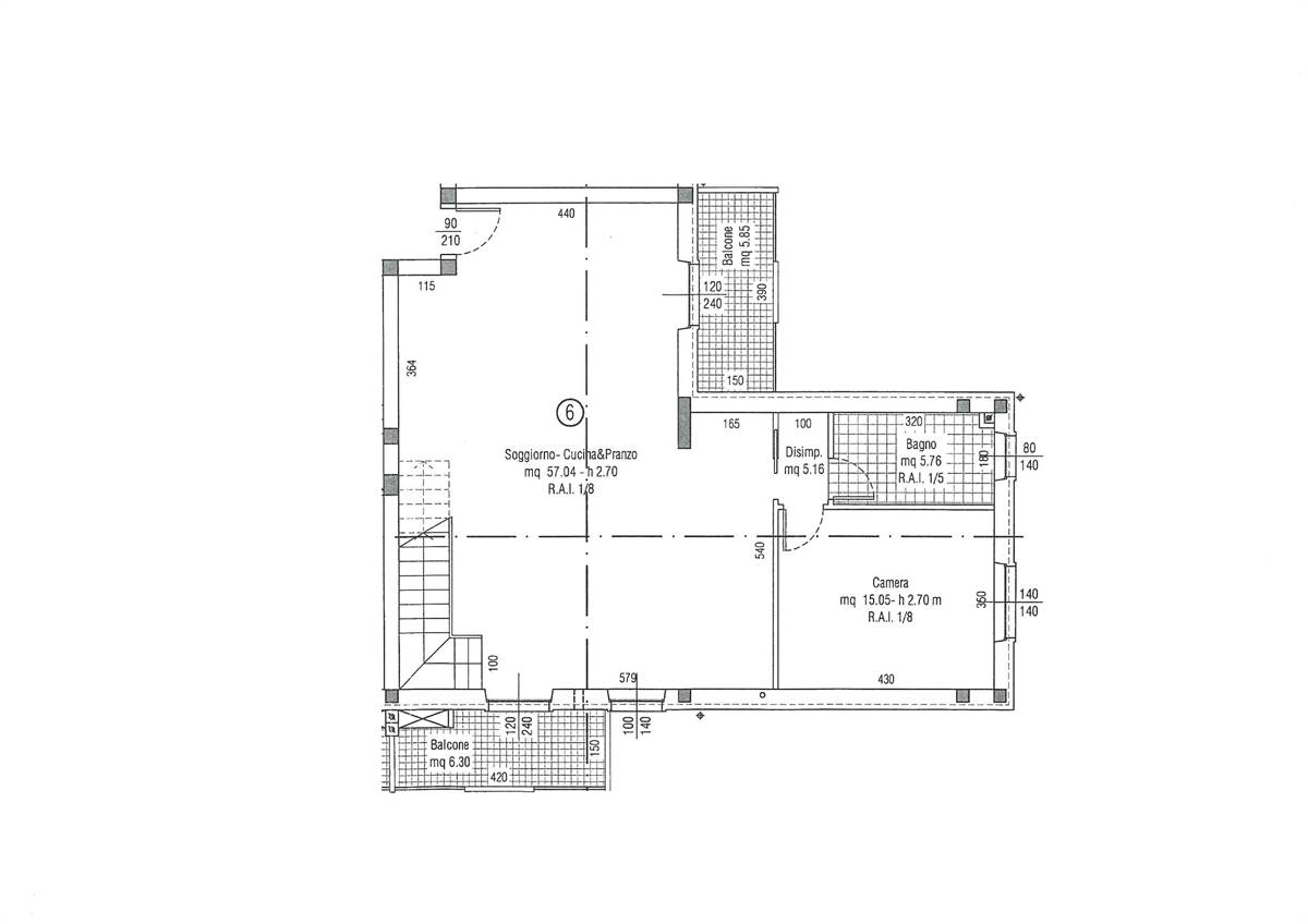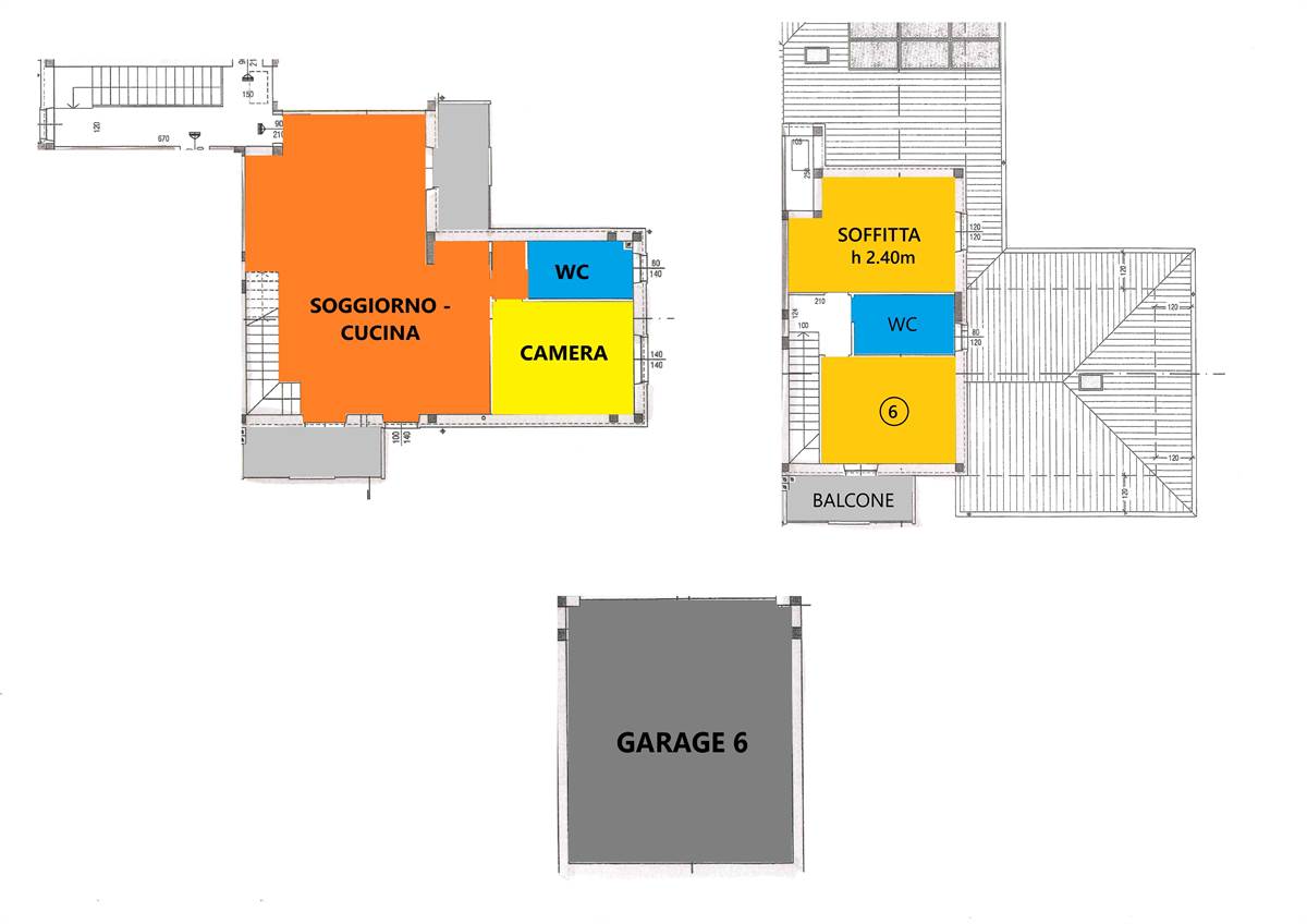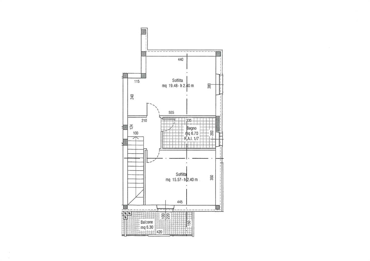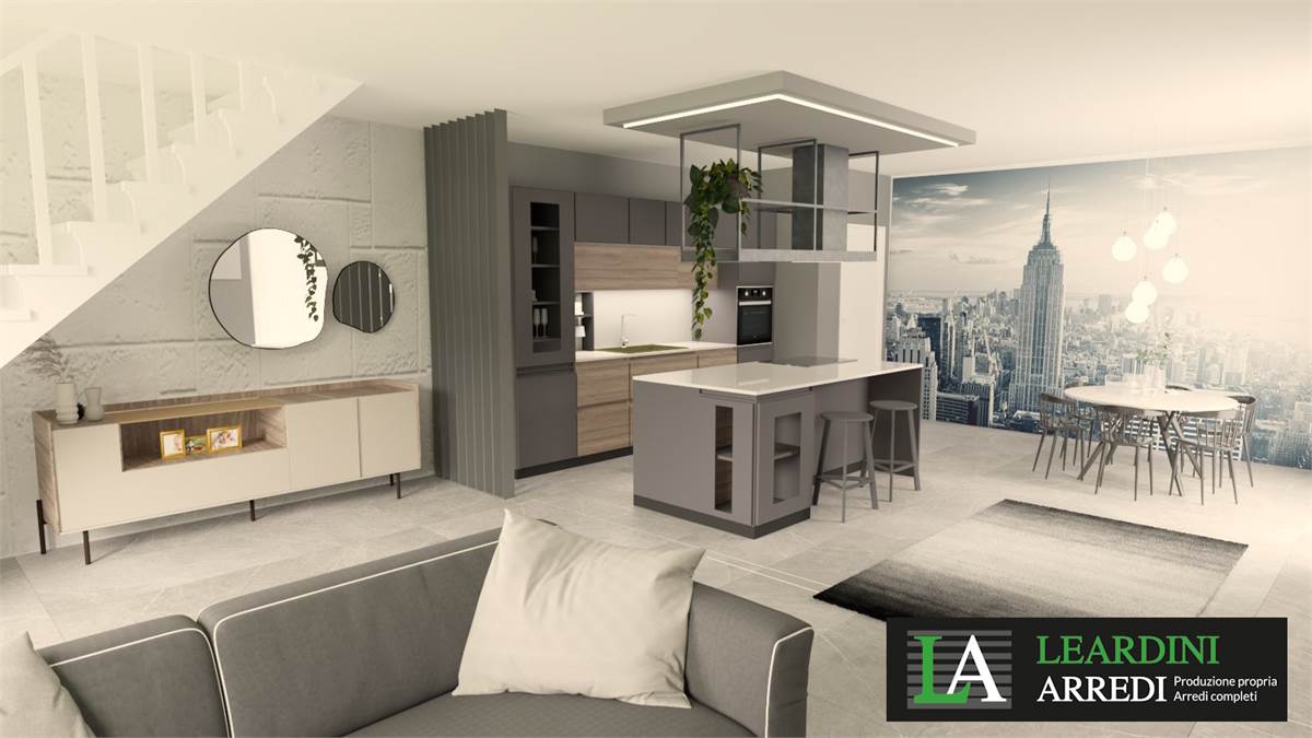 Disposto su due livelli internamente suddiviso in: soggiorno con balcone, cucina con balcone, disimpegno notte, bagno e camera matrimoniale; al piano superiore (che ha un'altezza costante di 2,40 mt) troviamo altre 2 camere grandi e il secondo bagno.